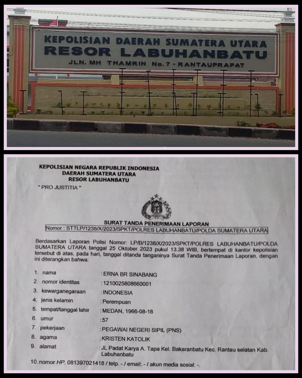 Menurut Erna sinabang, pengaduannya terhadap oknum ini di Sat Reskrim Polres Labuhanbatu dengan nomor LP/B/1238/X/2023/SPKT/POLRES yang dilaporkan 25 Oktober 2023, namun hingga saat ini sudah tahun 2025 belum juga ada kelanjutannya