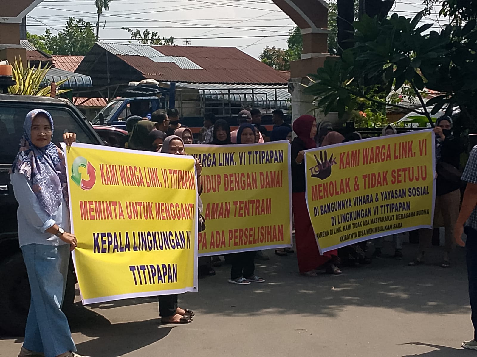 Annanews.co.id || Medan Deli – Warga Lingkungan VI Kelurahan Titi Papan Kecamatan Medan Deli melakukan aksi damai di Kantor Camat Medan Deli. Dalam aksi unjuk rasa damai tersebut, Warga membentangkan sejumlah spanduk dan poster yang bertuliskan “Kami Warga Lingkungan VI, Menolak dan Tidak Setuju Dibangunnya Vihara dan Yayasan Sosial di Lingkungan VI Titi Papan, karena di Lingkungan Kami tidak ada Masyarakat yang Beragama Budha, Akibatnya Bisa Menimbulkan Sara”, (18/9/2025).