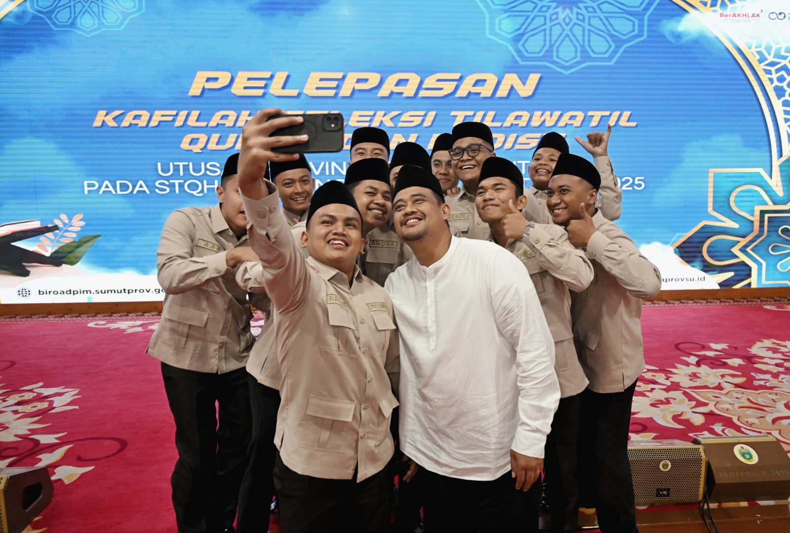 Annanews.co.id || Medan – Gubernur Sumatera Utara (Sumut) Bobby Nasution secara resmi melepas keberangkatan Kafilah Sumut, yang akan bertanding di Seleksi Tilawatil Qur’an dan Hadits (STQH) ke-28 tingkat nasional di Kendari, Sulawesi Tenggara. Acara pelepasan berlangsung di Aula Tengku Rizal Nurdin, Jalan Sudirman No. 41 Medan, Selasa (7/10/2025) malam.