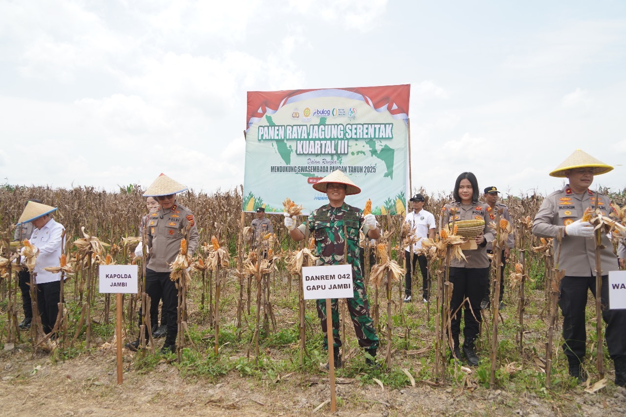 Brigjen TNI Heri Purwanto, S.E., M.Sc., Danrem 042/Gapu, bersama Kapolda Jambi Irjen Pol Krisno H Siregar, Gubernur Jambi Dr. H. Al Haris, dan Bupati Tanjab Timur Dillah Hikmah Sari, menghadiri panen raya jagung serentak kuartal III jajaran Polri yang tersebar di sejumlah daerah seluruh Indonesia.
