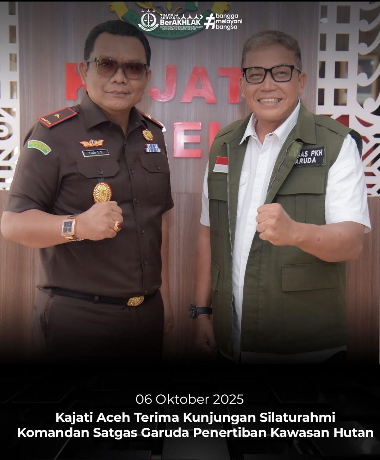 Annanews.co.id || Banda Aceh – Kepala Kejaksaan Tinggi Aceh, Yudi Triadi, S.H., M.H., menerima kunjungan silaturahmi Komandan Satuan Tugas Penertiban Kawasan Hutan (Satgas PKH), Mayjen TNI Dodi Triwinarto, di ruang kerja Kajati Aceh, Senin (6/10/2025).