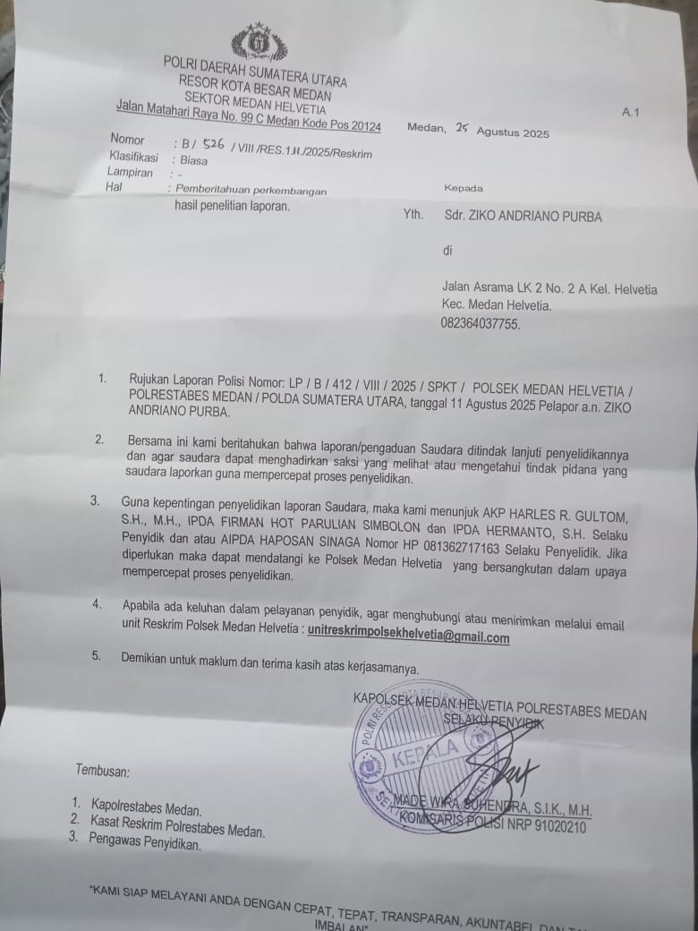 Berdasarkan atas laporan sebelumnya, POLSEK Medan Helvetia melalui Reskrim telah merespon laporan masyarakat dengan menerbitkan surat pemberitahuan hasil LP dengan nomor: B/526/VIII/RES.1.II/2025.