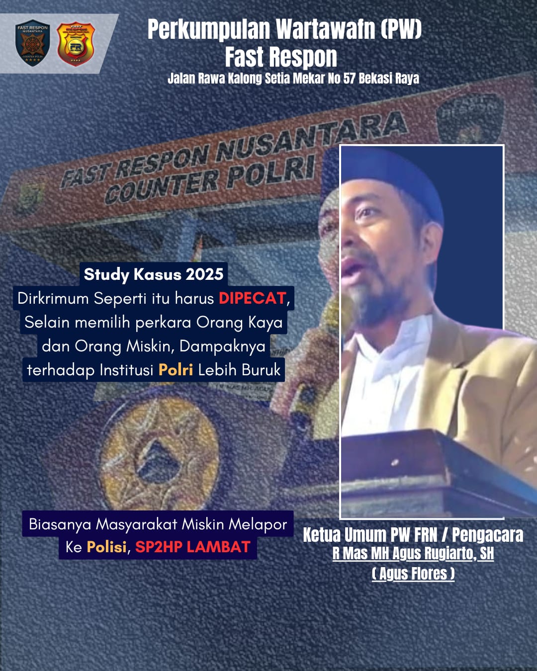 Annanews.co.id || Jakarta — Ketua Umum Pimpinan Wilayah Fast Respon Nusantara (PW FRN) Counter Polri Nusantara, Agus Flores, menyampaikan kritik keras terhadap dugaan praktik diskriminatif dalam penanganan perkara di lingkungan Kepolisian Republik Indonesia.Tanggal: 15 Oktober 2025