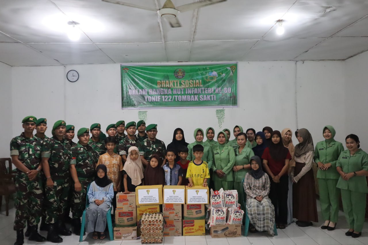 Peringatan HUT Infanteri ke – 80 Tahun Yonif 122/TS membagikan sembako ke Panti Asuhan dan Madrasah