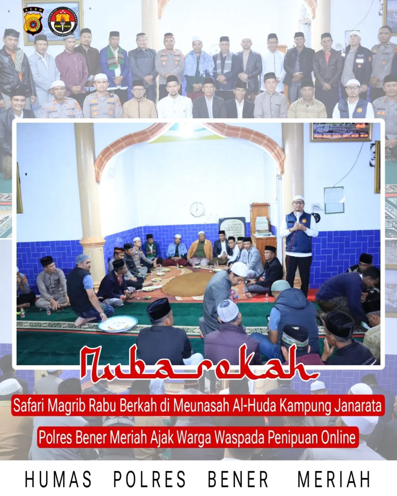 Annanews.co.id || Bener Meriah – Polres Bener Meriah bersama IAIN Takengon dan Pemkab Bener Meriah menggelar kegiatan Safari Maghrib Rabu Berkah (Mubarakah) di Meunasah Al-Huda Kampung Janarata, Kecamatan Bandar, Rabu malam (15/10/2025).