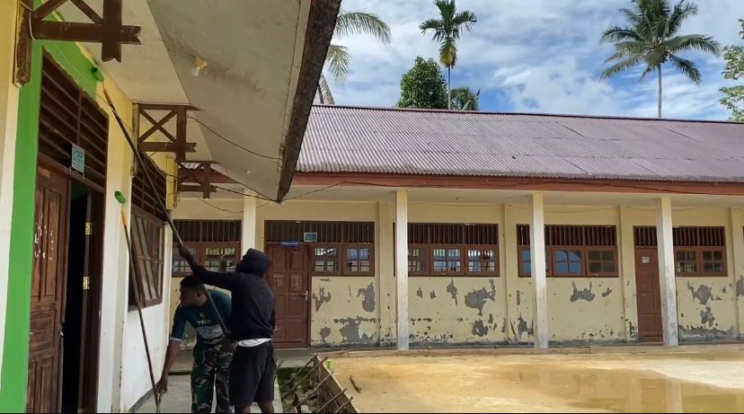 Annanews.co.id || Kokas — Prajurit Satgas Pengamanan Perbatasan (Pamtas) RI-PNG dari Yonif 763/SBA Pos Kokas bersama masyarakat setempat melaksanakan kegiatan gotong royong pengecatan sekolah sebagai bentuk kepedulian terhadap dunia pendidikan dan lingkungan di wilayah tugas mereka. (1/12/2025).